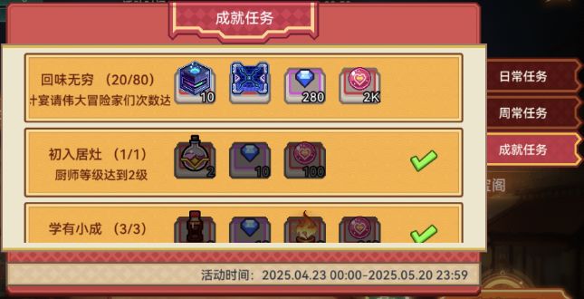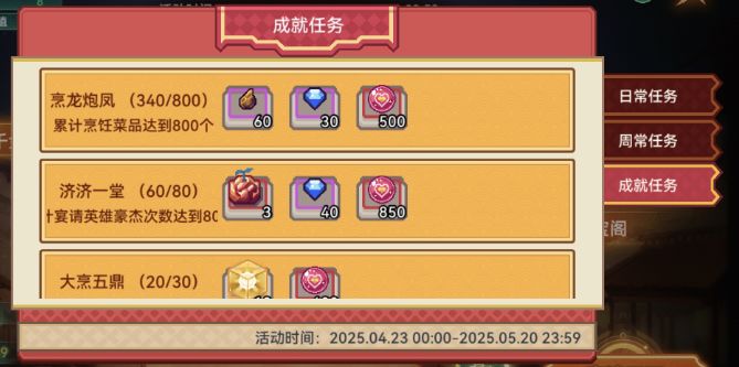 800个 每天30个 27天完成810个菜品(记得每天看看NPC想吃啥菜,优先烹饪完再拉满当日烹饪数量)(虽然28天的活动你让我几乎全勤有点可恶)