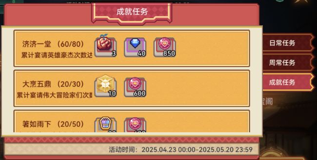 80次 每天4次 20天完成(右下角-宴请天下-宴请NPC)
