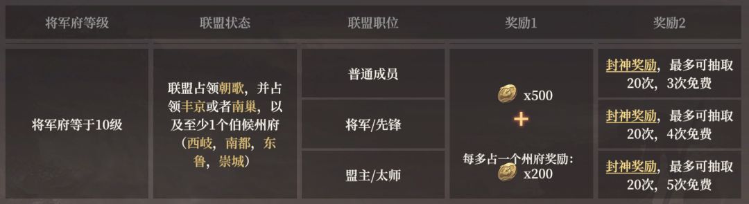 赛季结束时,将会根据将军府等级和联盟占领情况,发放对应的奖励当将军府等级不足10级时无法获得奖励,将军府达到10级时,根据联盟占领州府数量和担任联盟的官职,获取对应档位的奖励。