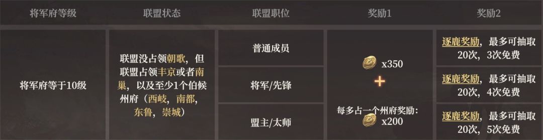 逐鹿奖励属于第二档奖励内容。需要个人将军府等级达到10级,联盟没有占领朝歌,但联盟占领丰京或者南巢,以及至少1个伯候州府(西岐,南都,东鲁,崇城)达到以上成就,玩家可以解锁【逐鹿奖励】卡包,不同官员获得奖励内容不同。具体请看下图↓