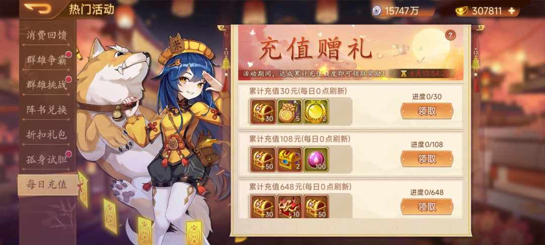 活动内容:活动期间,单日充值达到目标值即可领取奖励!