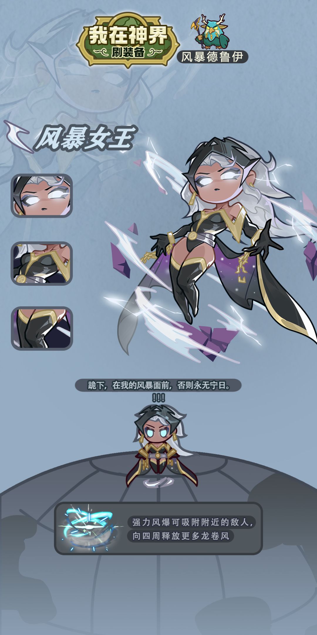 皮肤效果预览:新增攻击效果-强力风暴,每隔一定时间对周围释放一次带牵引效果的强力风暴攻击怪物,星级提高后局内可初始获得一张卡牌,并增强强力风暴的攻击效果。