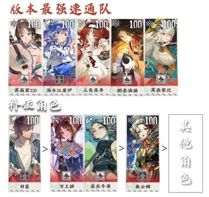 其余角色都为次选:酒帐补输出、仙鹤商周提供啸剑蓄势、维纳斯给输出增伤,等等