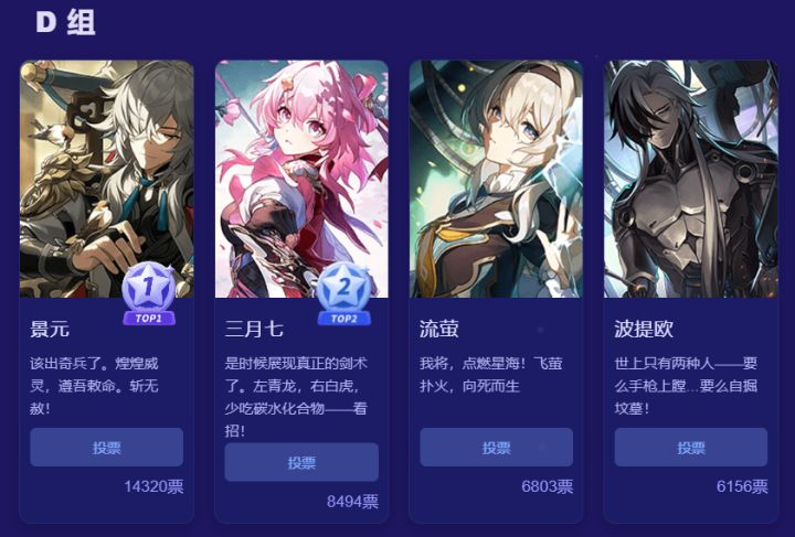 在D组排名中,景元以14320票获得该组第一,其次则是三月七、流萤、波提欧、大黑塔、飞霄。