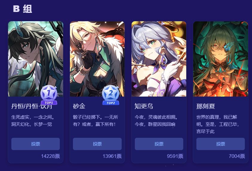 在B组排名中,饮月君/丹恒以14228票获得该组第一,其次则是砂金、知更鸟、那刻夏、镜流、花火。