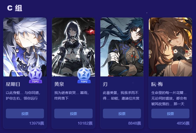 在C组排名中,星期日以13979票获得该组第一,其次则是黄泉、刃、阮梅、真理医生、乱破。