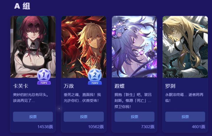 在A组排名中,卡芙卡以14538票排名第一,其次则是万敌、遐蝶、罗刹、缇宝、阿格莱雅。