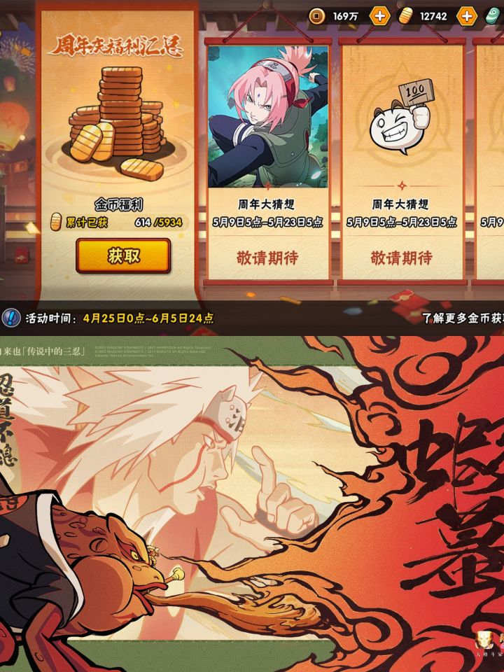 5月10日本周六晚上18点关注木叶情报会解锁自来也[传说中的三忍]全技能情报,5月16日正式上线游戏中。
