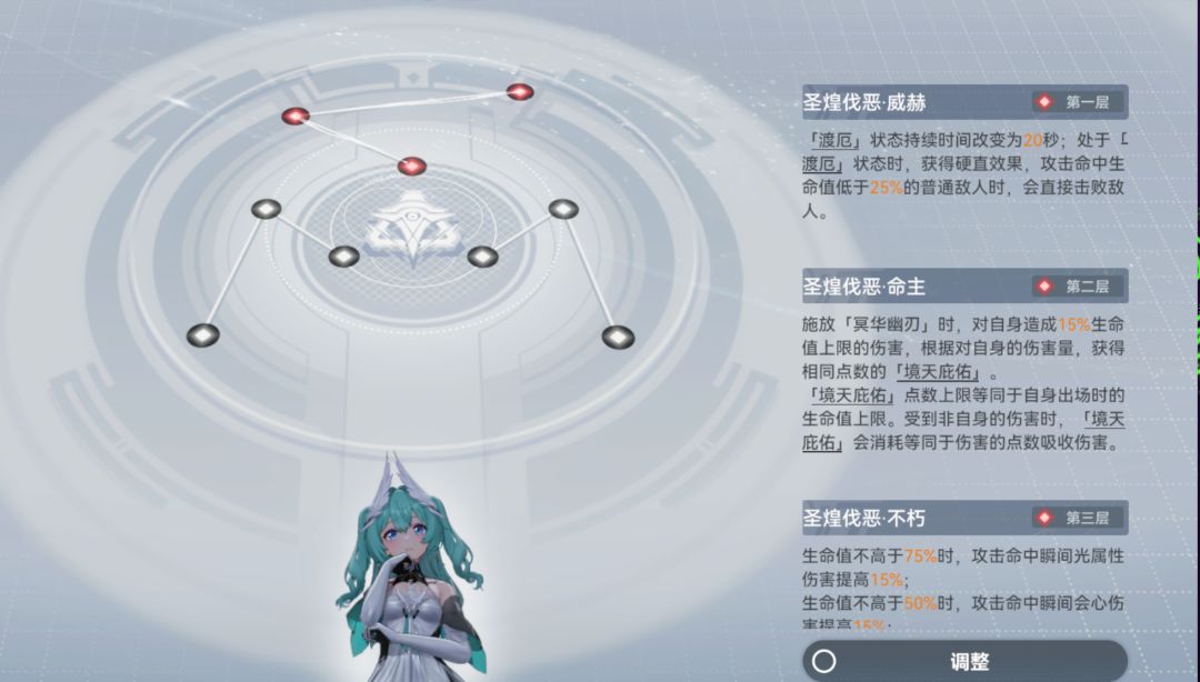 生命值上限百分比提高 释放奥义/连携全队光属性暴击率提高 黄3神格:全队生命上限和大于基准增加全属性伤害 红3神格:自身最大生命值每比基准多固定值独立伤害提高 蓝3神格:自身最大生命值每有固定值 光属性队友伤害上升