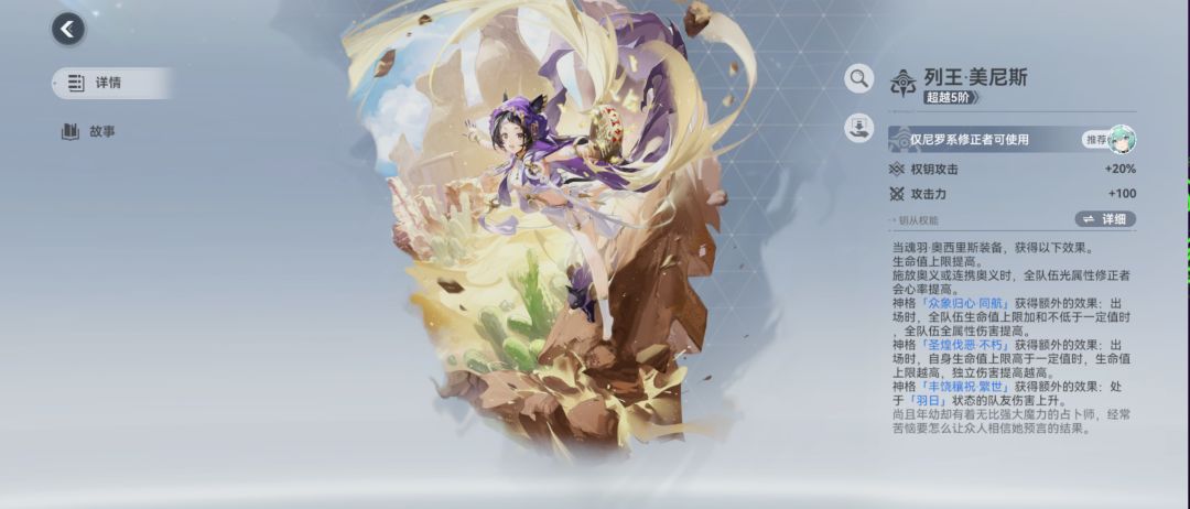 5+2专武:生命值上限+50% 释放奥义/连携全队光属性暴击率+25% 蓝3神格:出场每有2700生命值 光属性队友伤害最多+25% 黄3神格/红3神格效果升阶不变