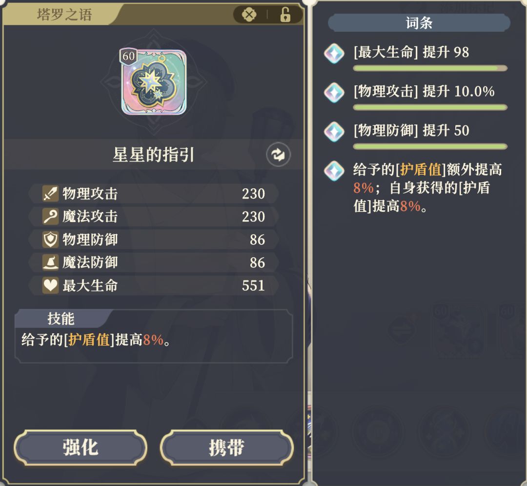 特殊词条:给予的[护盾值]额外提高8%;自身获得的[护盾值]提高8%。