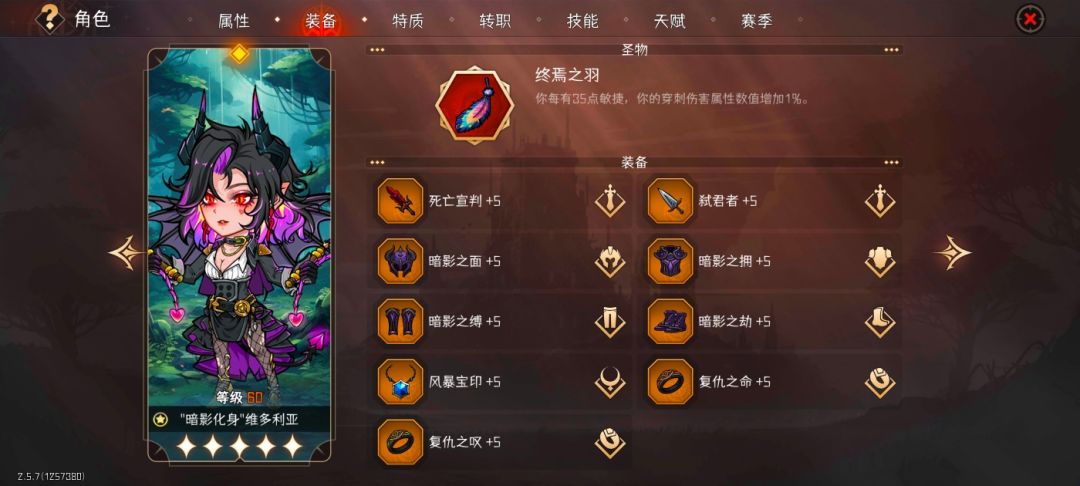 装备属性优先堆命中,爆伤,所有伤害,副属性穿刺,圣物羽毛。(我两把武器都没爆伤词条,少了近40的爆伤伤害还够