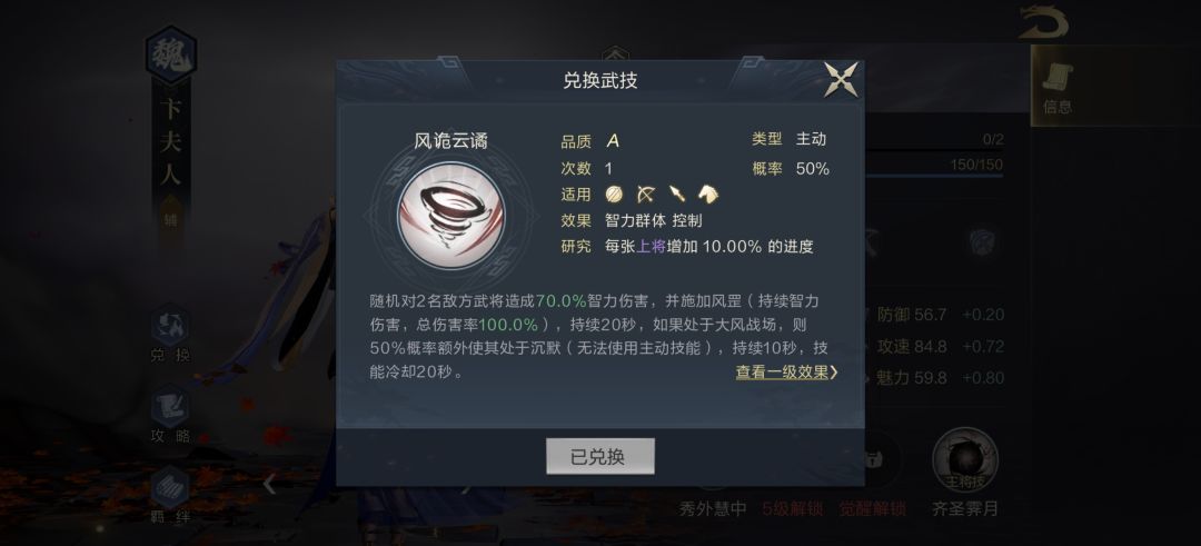 与水淹七军极为相似的武技还有:使用黄月英兑换的烈火燎原和使用卞夫人兑换的风诡云谲。