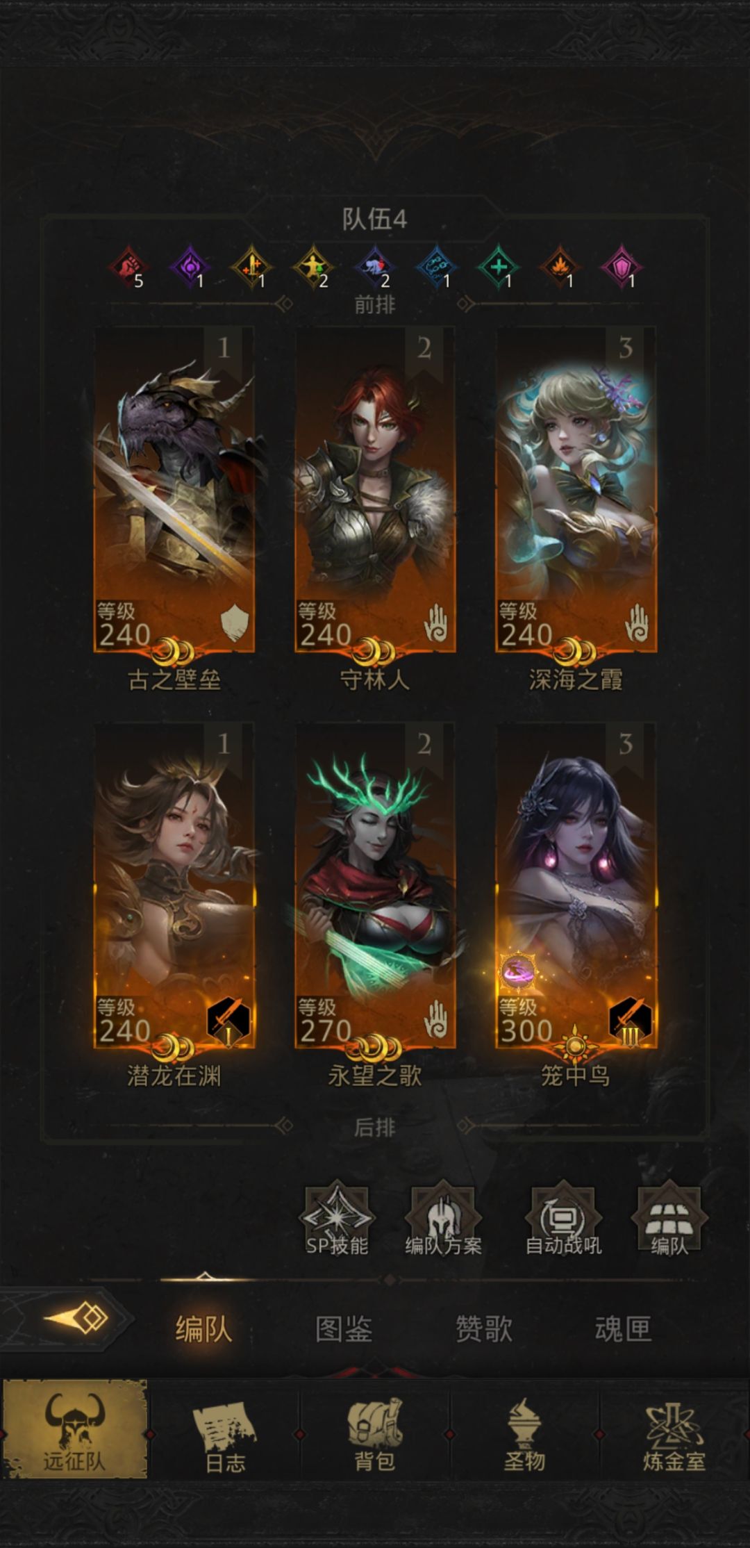 开局5秒内打不到90血以下,小怪承伤叠起来就没得打了,谁能到这儿的时候硬打过去呢?不过还好这个图可以不打怪偷渡,两天收菜拿下海神号角,现在只差灰石岛就可以去肇启之路了,后附目前阵容及面板。
