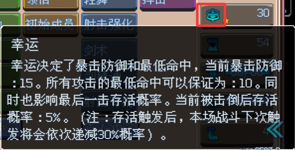 幸运-25。每次触发后,本场战斗将降低30%。例如幸运值为150,则第一次存活概率为125%,第二次为95%,第三次为65%。。。直至变为0%。 队伍中一些不擅长战斗的辅助勇者可以专注提高此属性。