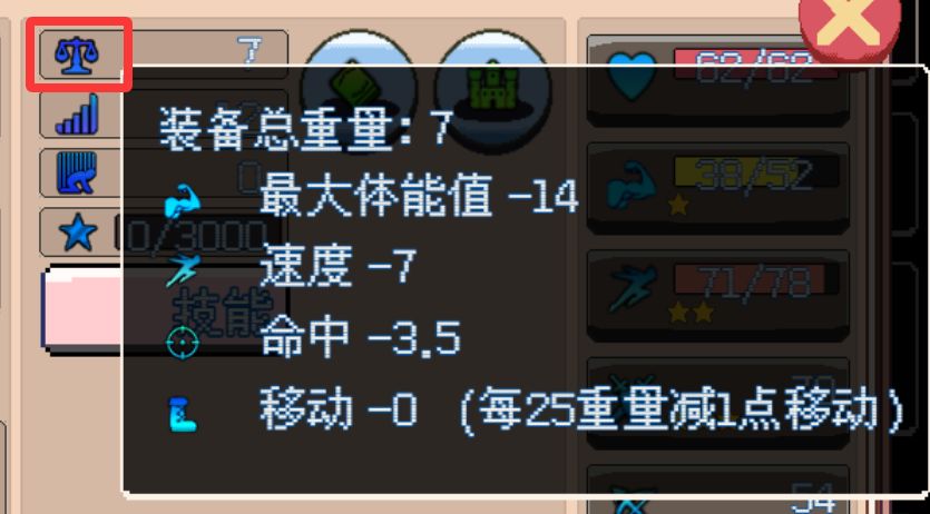 每个装备都有其重量,每1点重量降低2的最大体能值,1的速度,0.5的命中 ,25点重量降低1点移动。