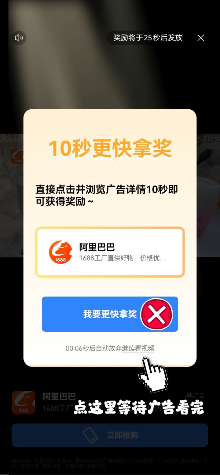 4.30秒以上的广告,会在若干秒后弹框告诉你“可更快获得奖励”,不要点,选择“继续看视频”即可。