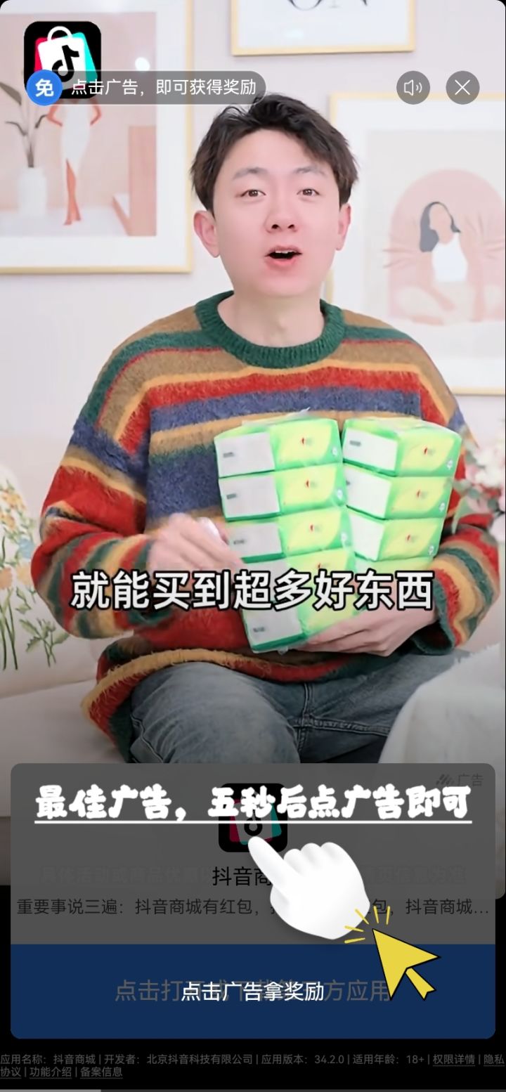 )点击需要打开本地的APP,点击后不用打开,点下叉关闭后直接领取奖励;2.第二种5秒广告,点击需要换起微信小程序,让它自动拉起微信后,切回游戏即可领取奖励;