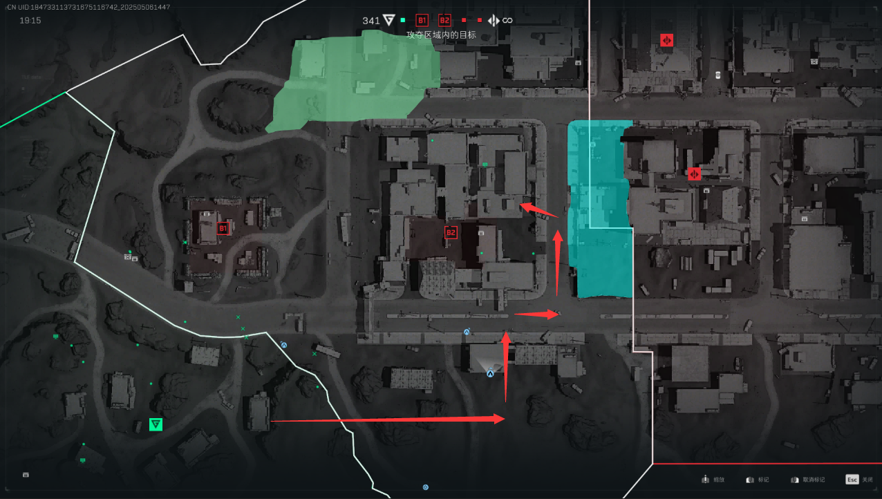 有了上面的理论分析作为指导,那么我们的进攻思路也就清晰明了。我们在从A转B的倒计时阶段就可以在地图下方的区域做准备了。等待倒计时结束之后就可以从房子中间的胡同直接翻墙进入B2区域,然后再想办法进入房顶。
