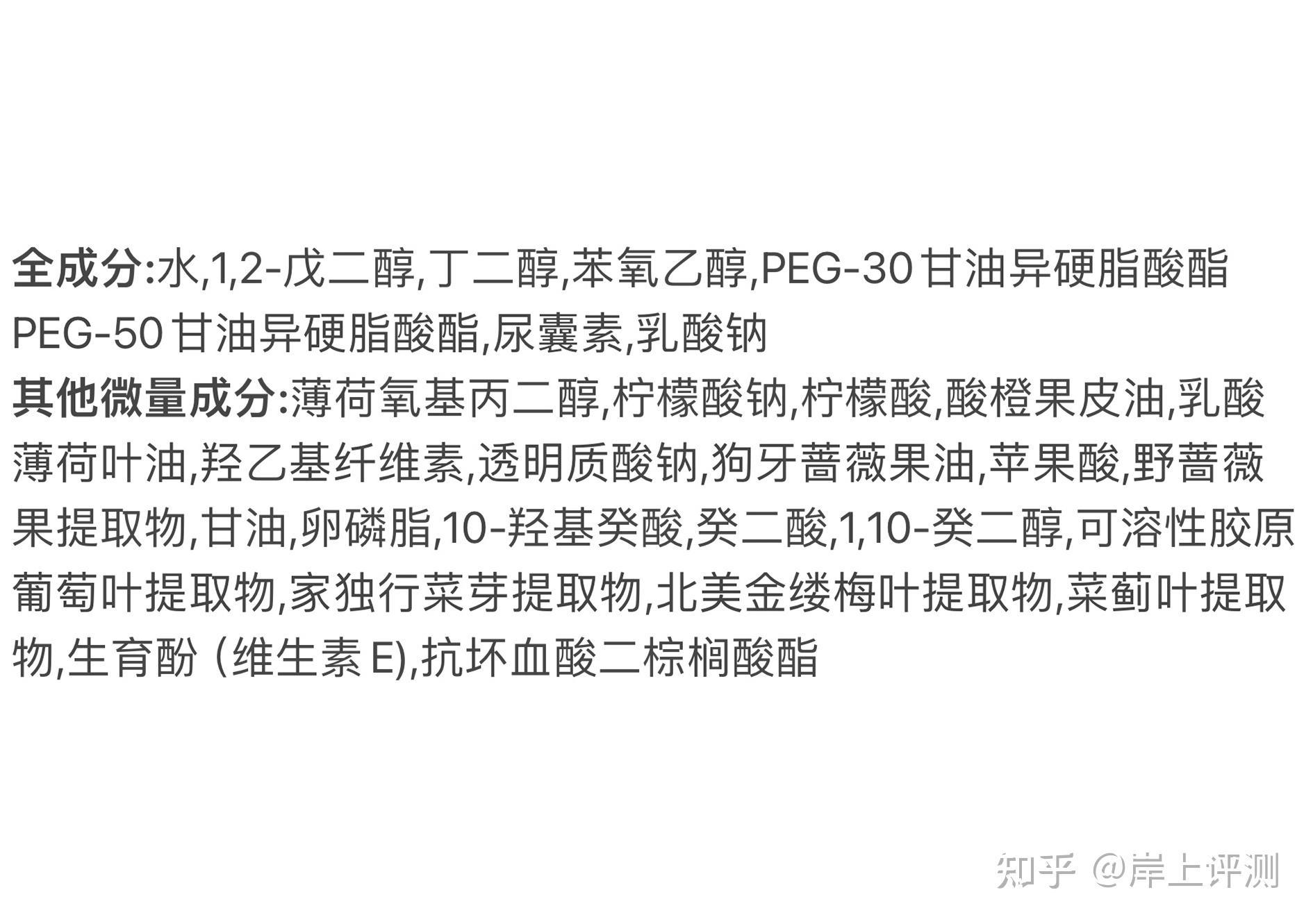 再看看成分,以前的成分可以乱序,把一些好的成分都排在前面,很容易让人误读,在新的法规下,重新备案后,才发现,这些年大家被骗的不轻。水是溶剂,1,2戊二醇,丁二醇,尿囊素,乳酸钠,以及微量的甘油,透明质酸钠,构成保湿体系,还有一些微量的植物油,质地上会显得有点油状感,实际使用起来,保湿效果比较弱。防腐剂,苯氧乙醇,排在成分表第四位,添加量不低,有些人用了有灼热感,可能就是这个引发的。香型和体感,主要是有薄荷氧基丙二醇,薄荷叶油的添加,肤感清凉带有薄荷糖香味。主打的成分是,柠檬酸,乳酸,苹果酸的复合物,属于微量成分,单个添加量不超过0.1%,满打满算,也就0.3%的添加,添加量很低,对于调节角质代谢,痘痘闭口黑头这些,作用是相当有限,北美金缕梅等多种植物提取物,主要是围绕着这些微酸的体系,带有舒缓效果,让使用起来更加的温和。10-羟基癸酸,可以抑制皮脂分泌,带有控油效果,对于不是那么油的皮肤来说,会有一点感知。这么解读下来,大家有没有发现,都从未涉及到所谓的收敛毛孔,只是商家的宣传,恰好满足了你的想像力,实际没啥用。