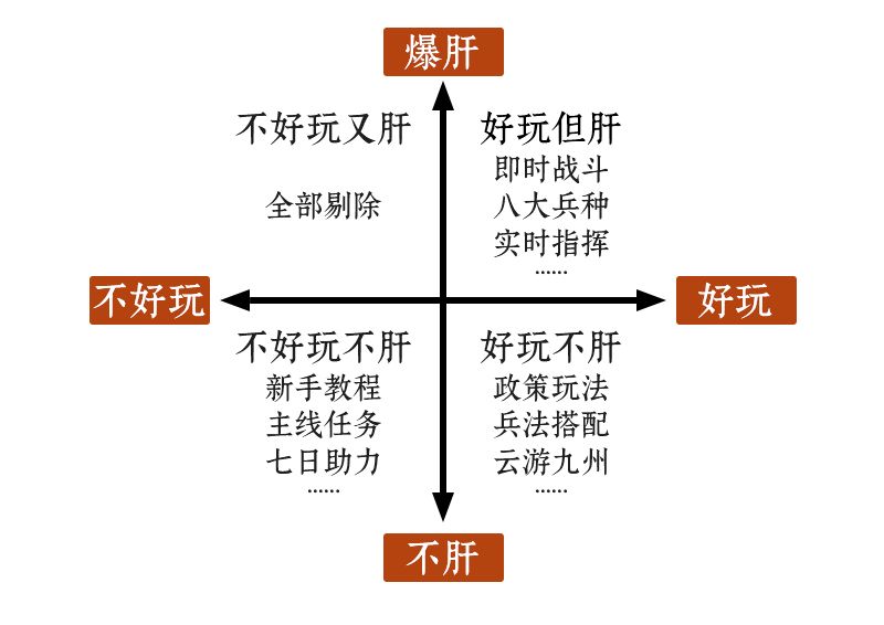 今天想跟你分享一张玩法分类图,横轴代表好玩程度,纵轴代表肝度。策划团队根据这个分类,把手头所有又肝又不好玩的玩法全给毙掉了。