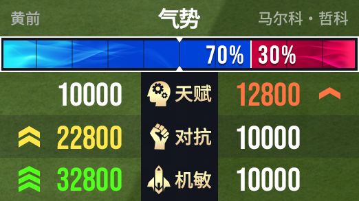 当三维属性更合理的领先对手,赢得比拼时,将会提升全队的整体表现。所以还需要玩家考虑如何组建更合理的倾向性阵容。例如下图中,经理人属性比拼结果会为主队(左边)的队伍的带来更大优势。