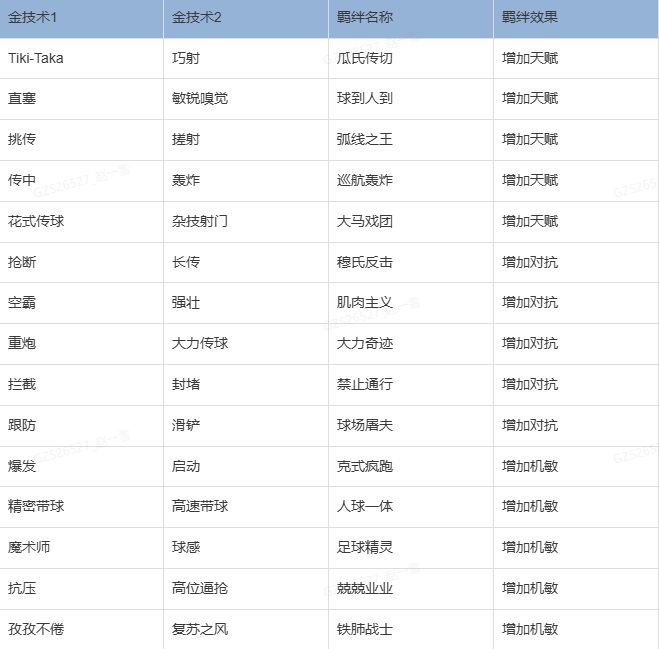 羁绊也主要分三种类型:增加天赋(传射为主的金技术组合)、增加对抗(防守强壮为主的金技术组合)、增加机敏(速度带球为主的金技术组合)。