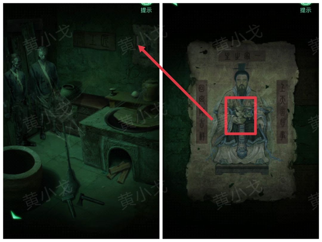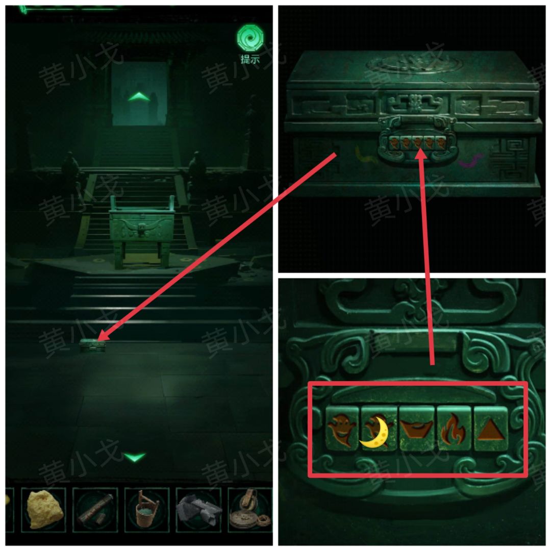 32.点击地上的匣子,根据各场景出现的图案,调整密码锁