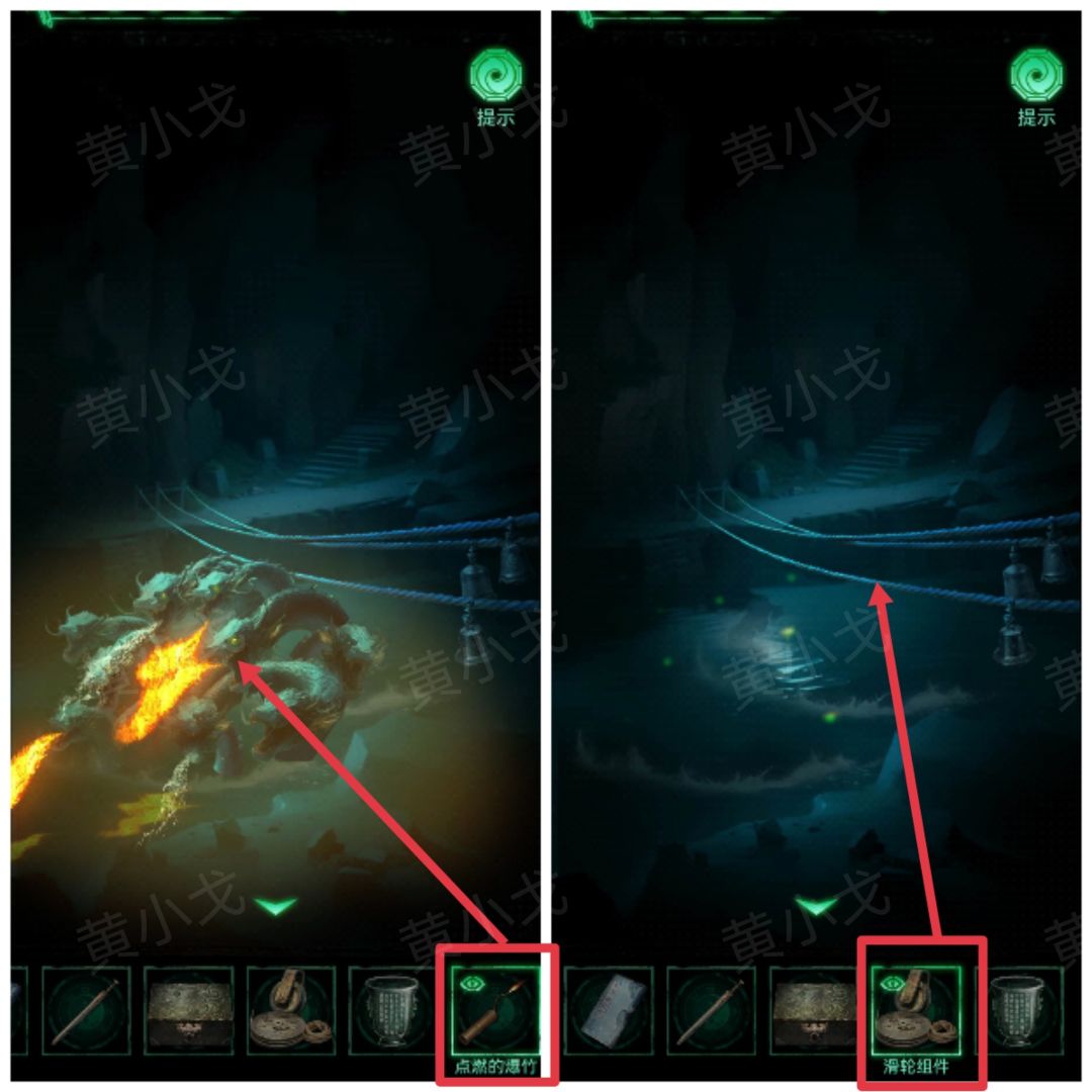 39.对九婴巨兽使用【点燃的爆竹】;把【滑轮组件】挂到索道上,触发剧情