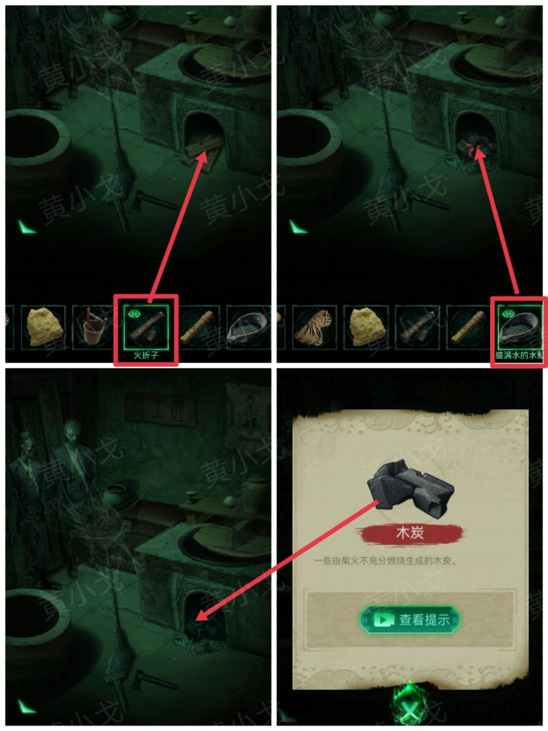 21.用【火折子】点燃灶孔里的木柴,再用【盛满水的水瓢】里的水浇灭,获得【木炭】