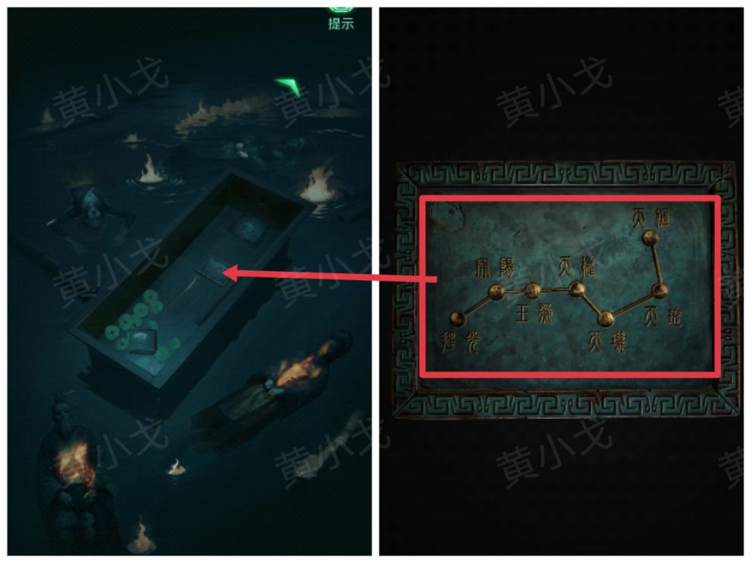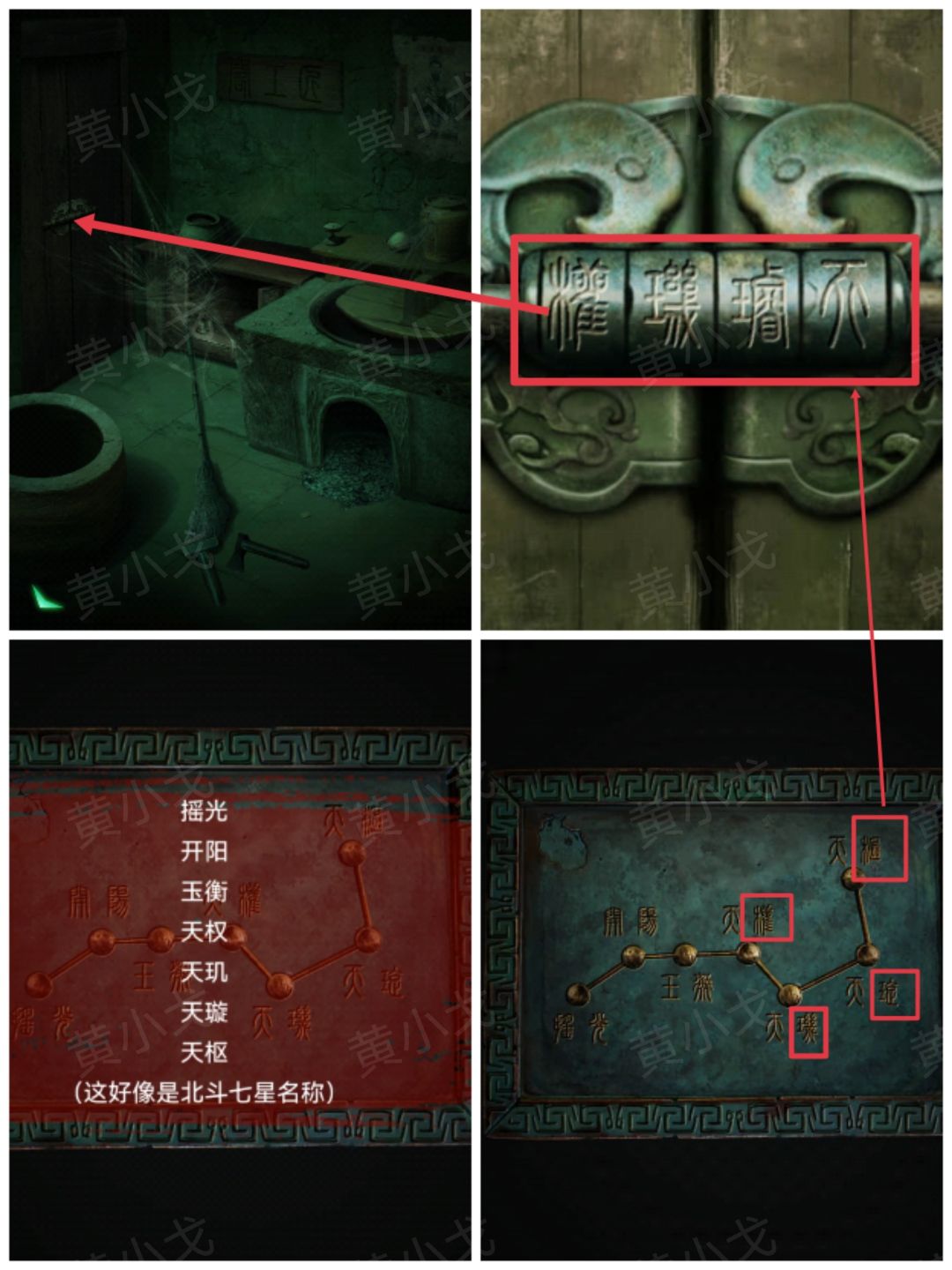 25.点击门上的密码锁,根据棺材上的七星板上北斗七星的名字,调整密码锁:权、玑、璇、枢