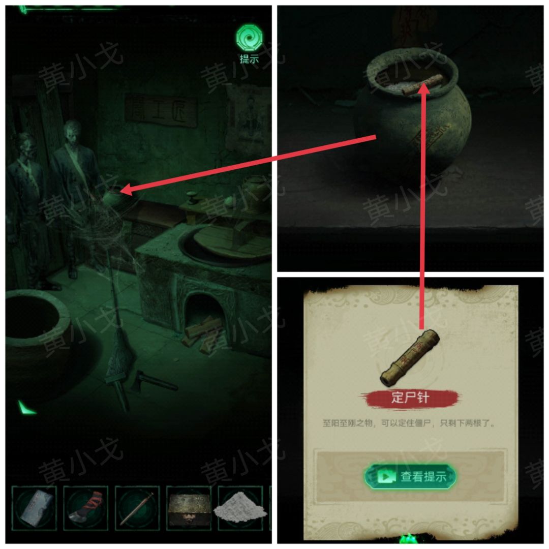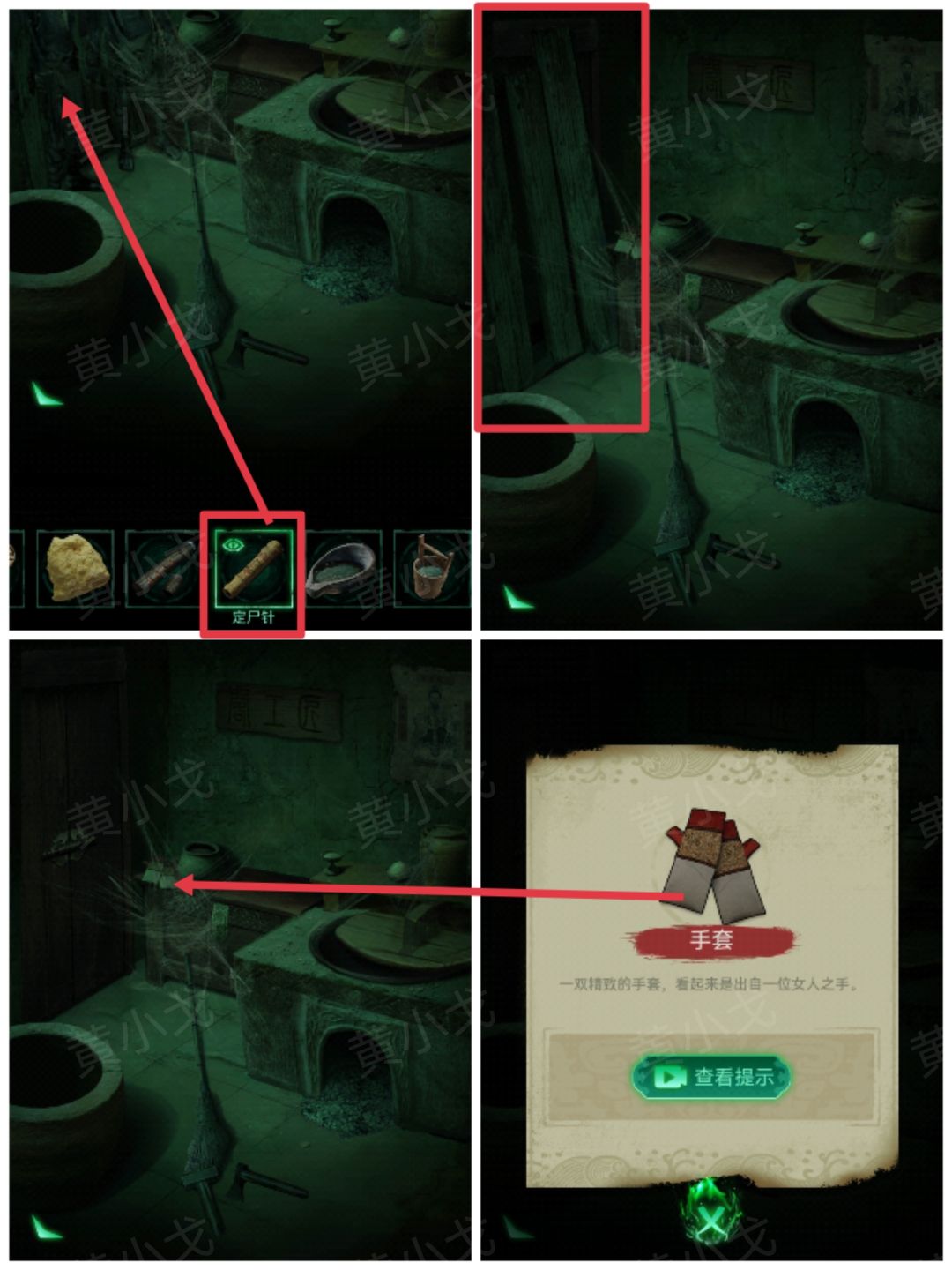 22.对僵尸使用【定尸针】,僵尸消失,拿开木板;拾取工作台上的【手套】