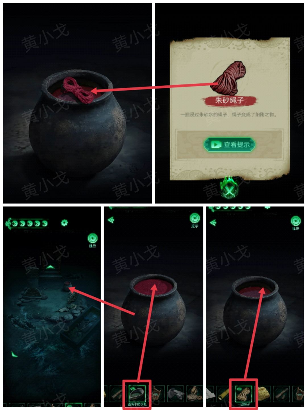 30.点击装有朱砂的罐子,倒入【盛满水的水瓢】;放入【一团绳子】,获得【朱砂绳子】
