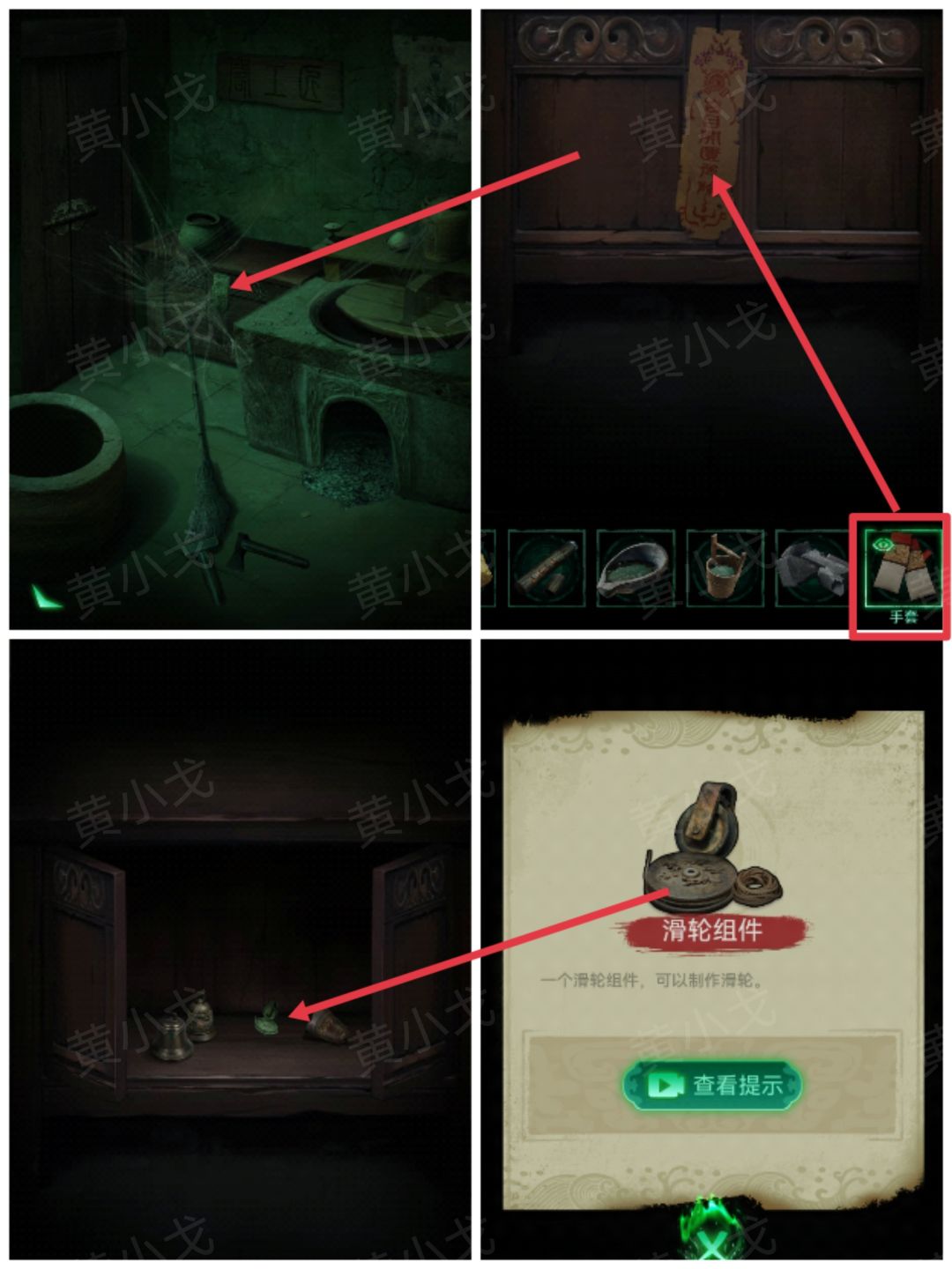 23.点击工作台柜子,用【手套】拿掉上面的咒符;打开柜子,获得【轮滑组件】