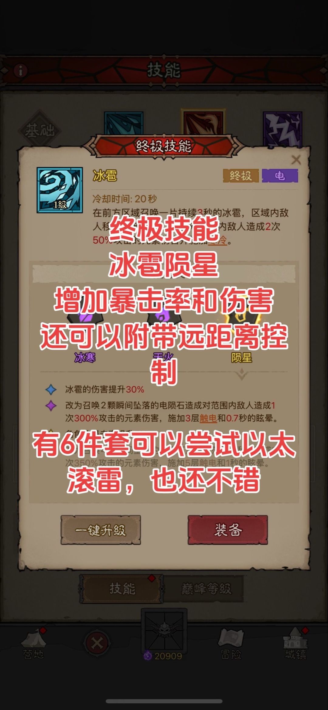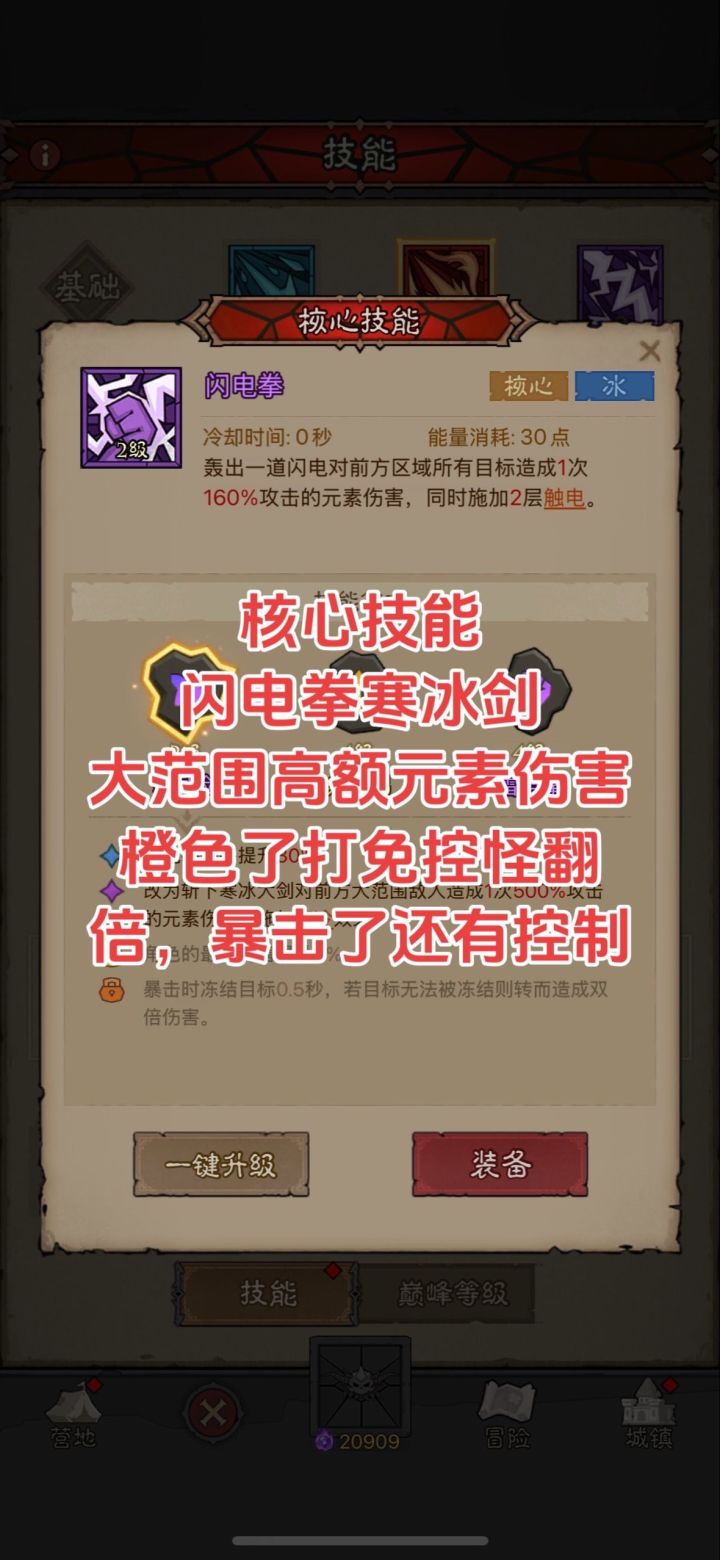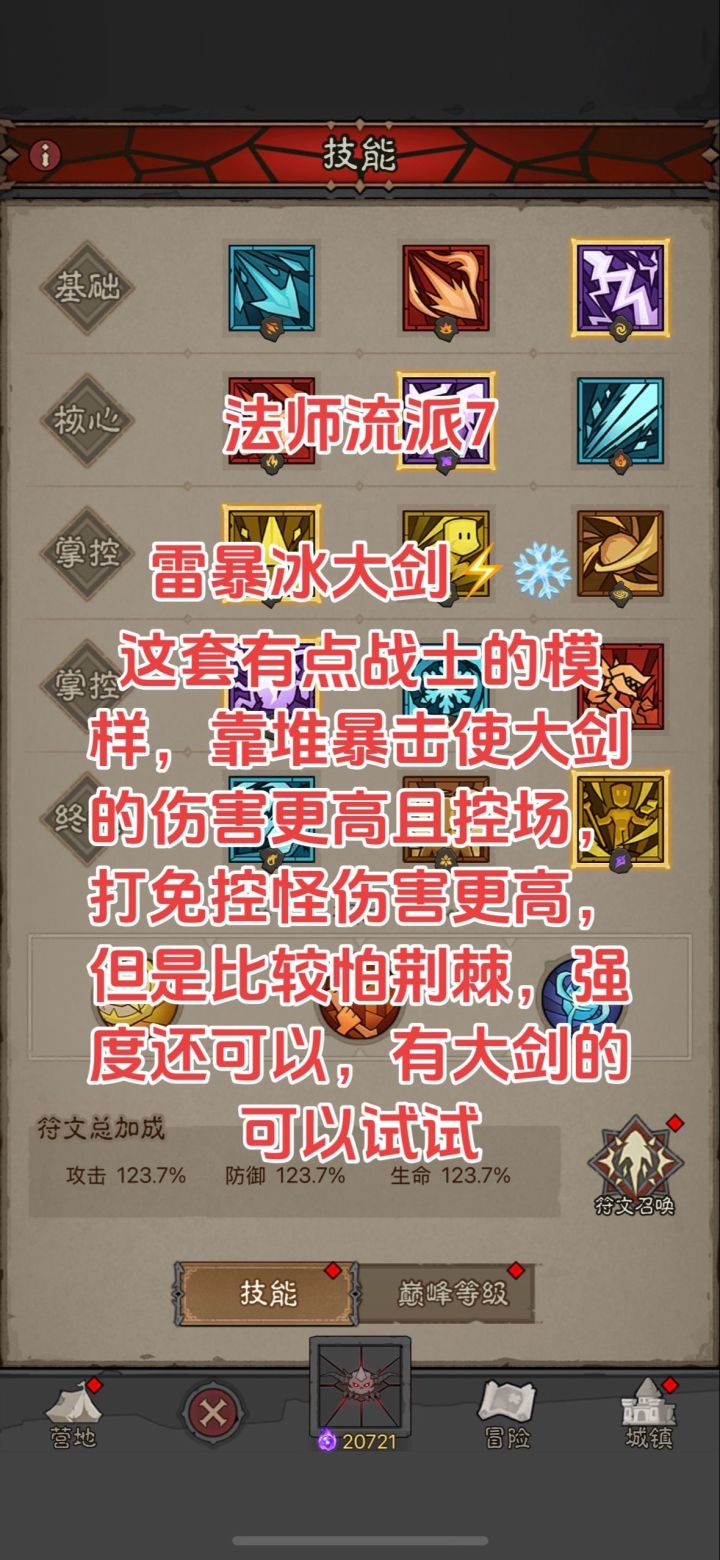 这套是冰大剑的开发,因为冰剑范围大且伤害高,吃暴击,配合雷的流派技能,契合度很高,强度大家可以试试,有点怕荆棘哦!不过也能玩