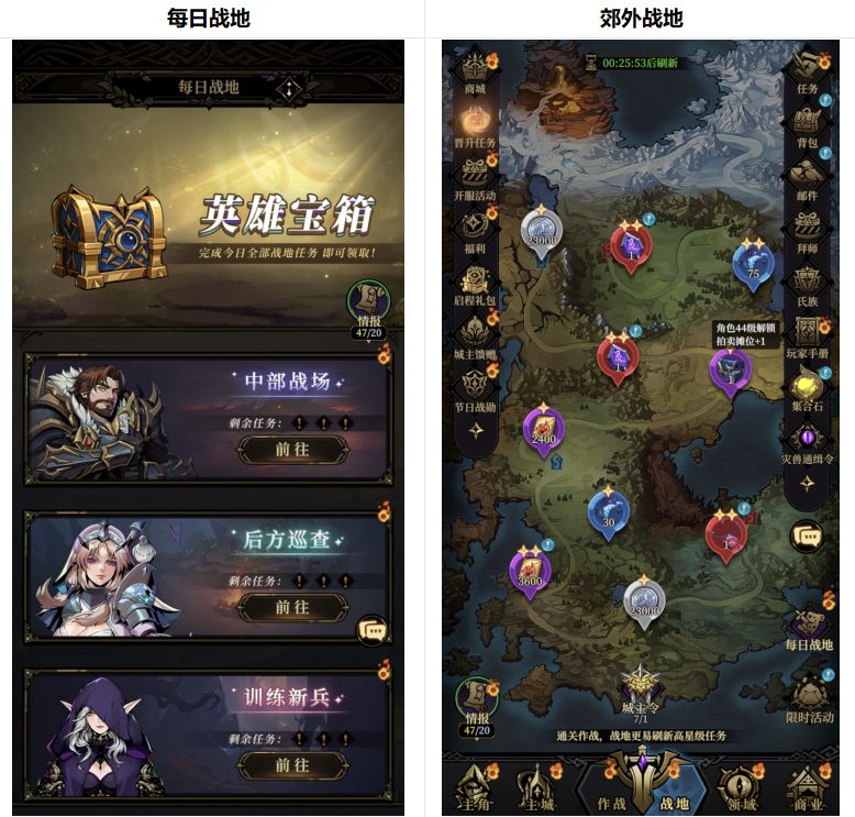 🔻23级之后开启战地,郊外战地消耗情报值相对较高,但获得的经验也是作战的多倍,战地星级越高的任务获得的经验越多,可以帮助快速升级(有月卡的情况可跳过1-2星任务,节约刷本时间),完成每日战地可获得神器锻造材料以及少量情报值;