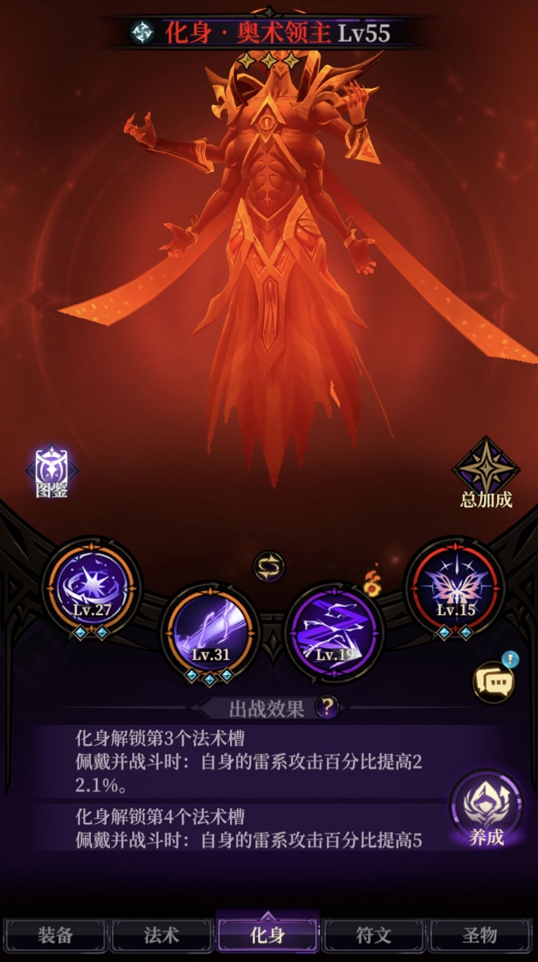 化身也可以佩戴法术技能,相当于我们在战斗中可以多使用四种法术,在战斗中提升我们的战力,并且化身不会在战斗中死亡;