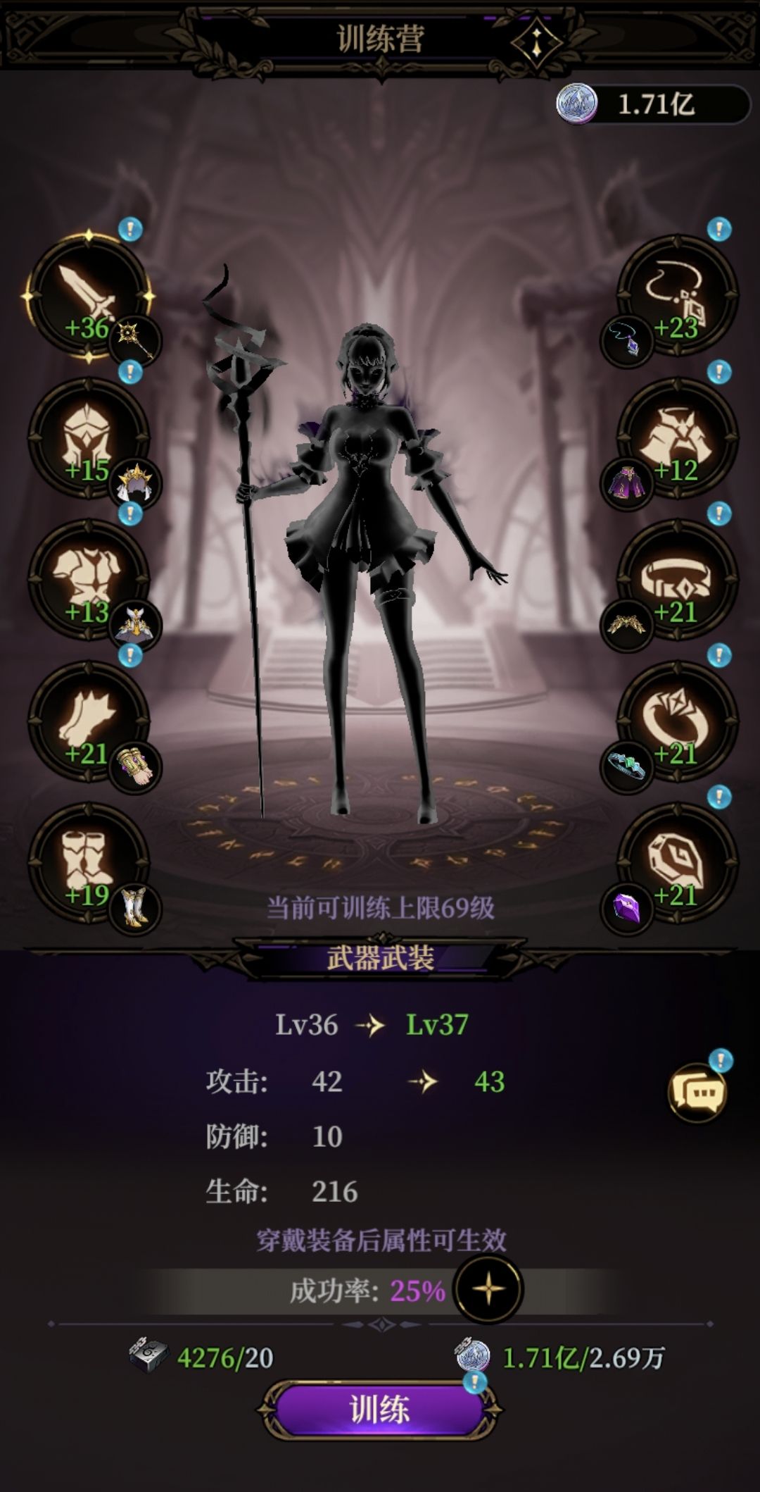 🔻在训练营提升每个部位的等级,可以提升角色的基础属性,只有穿戴装备的部位才可以训练。训练有几率失败,界面会显示成功率。训练等级上限受角色等级影响;