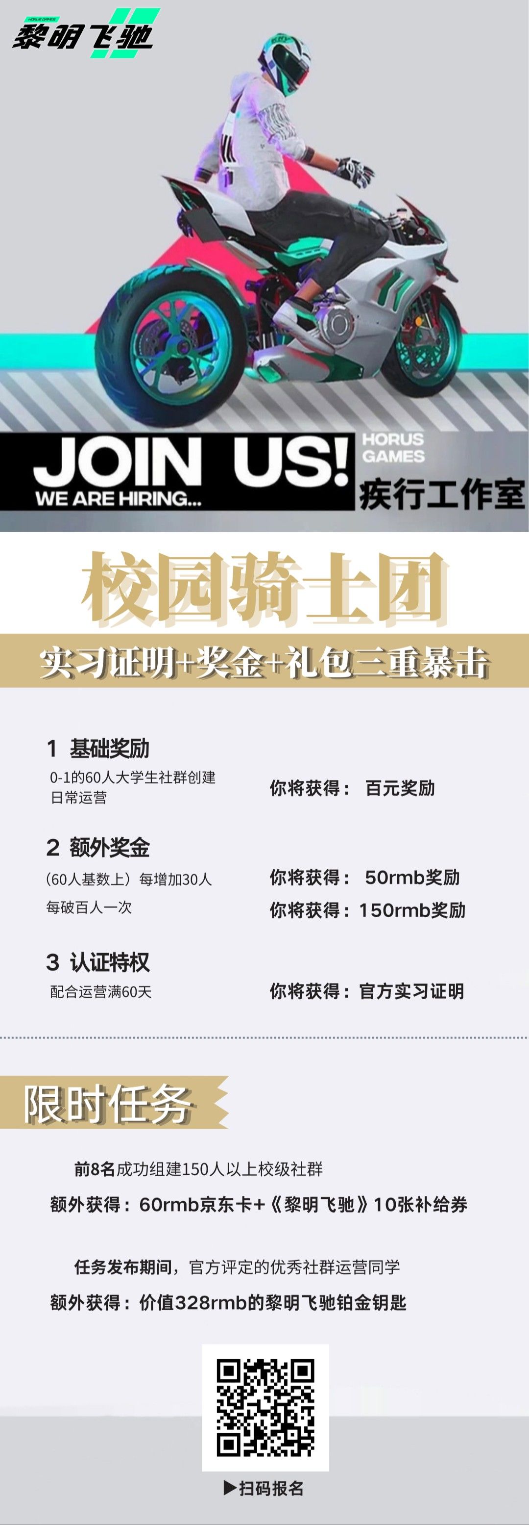 自摩托手游地平线《黎明飞驰》定档消息放出后,光头小摩托的私信就没停过啦!作为官方运营的“福利批发商”,今天正式启动大学生社群指挥官招募计划——现在联系我们,成为(黎明飞驰校园骑士战队首发成员),轻松get官方认证实习证书及丰厚的无门槛现金礼包,更有机会赢得黎明飞驰周边好礼~