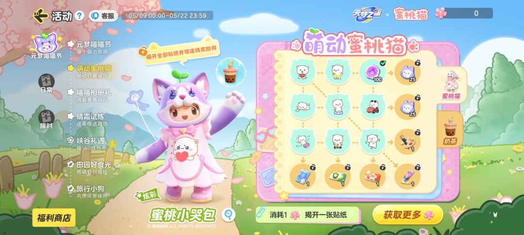 我们点开右上角的活动 再在“元梦喵喵节”一栏中找到“萌动蜜桃喵”活动页 点击进入就可以看到这个页面啦