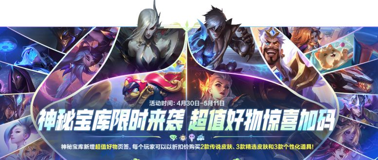神秘宝库,好物加码!截止至5月11日23:59,神秘宝库新增“超值好物”页签,召唤师可以以折扣价购买2款传说皮肤,3款精选皮肤和3款个性化道具~