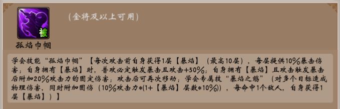 获得无双皮肤后进入战场可使用无双技【孤焰巾帼】获得顶级效果和专属技