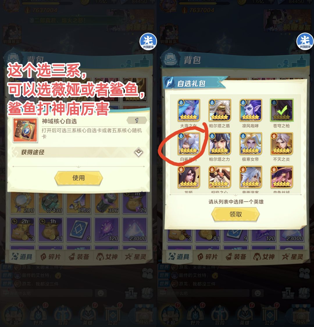 打神域完成任务会有这个自选卡,如果想提高共鸣等级的,选薇娅升星;想打神庙的,选鲨鱼。