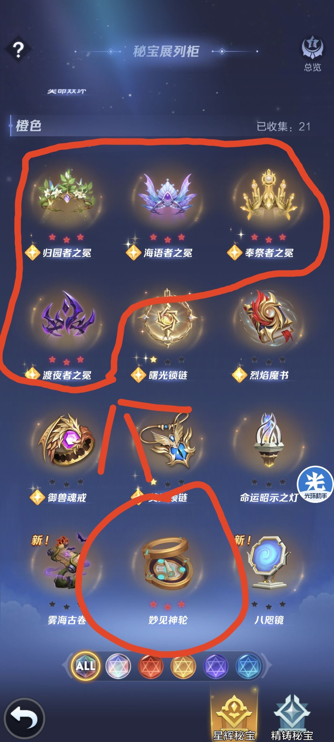 先把妙见神轮直升到觉醒,然后下次再选妙见神轮就会转换成通用橙色碎片,再把这通用橙色碎片去觉醒有速度加成或者光暗加成的秘宝