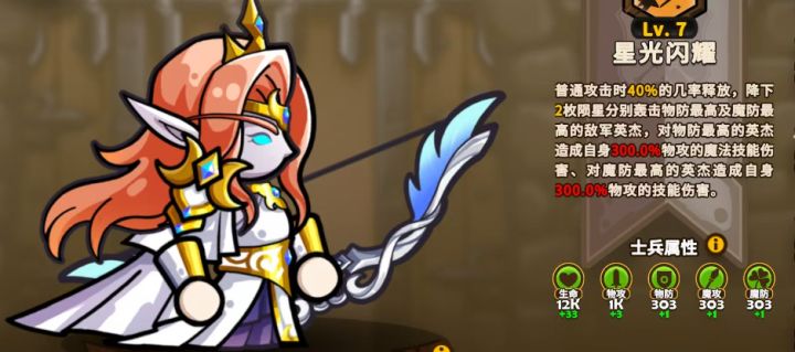 -实际为会对全场范围内两个单位造成1次伤害,对物防最高造成魔法伤害,对魔防最高造成物理伤害:通过战斗中英杰的属性构成能看出,一般物防最高的主要是盾,但是盾的魔法防御低,所以伤害可观;反制魔法防御最高的主要是法师,且法师物防低,伤害也是可观的。