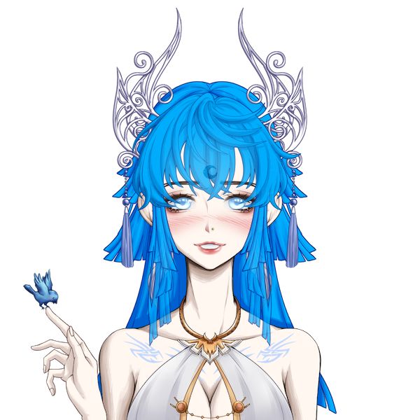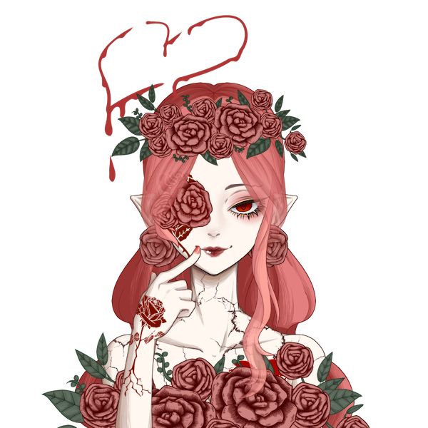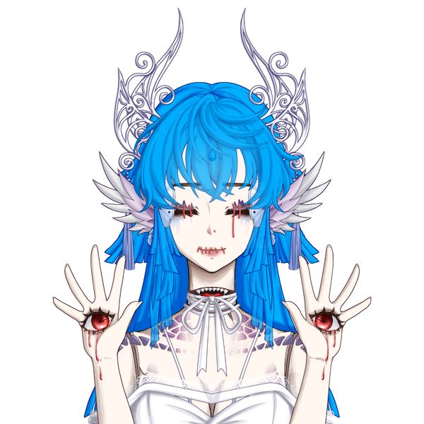 蓝发——她是天使的化身,有着天使的血统可以造福人类、进化自然,她帮了人给那么多,可是人类呢?把她的四肢绑住,把她的口眼封住只能为人类所用,她知道了人性,张出了双眼,红色的瞳孔中鲜血喷涌而出……人肉也很好吃
