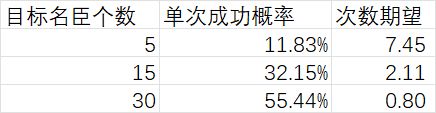 不难发现,这一概率是相当高的。尽管三选的概率和次数期望并不太乐观,但此时已是锦上添花,实际上想不想抓指定的那几个名臣完全是丰俭由人的。