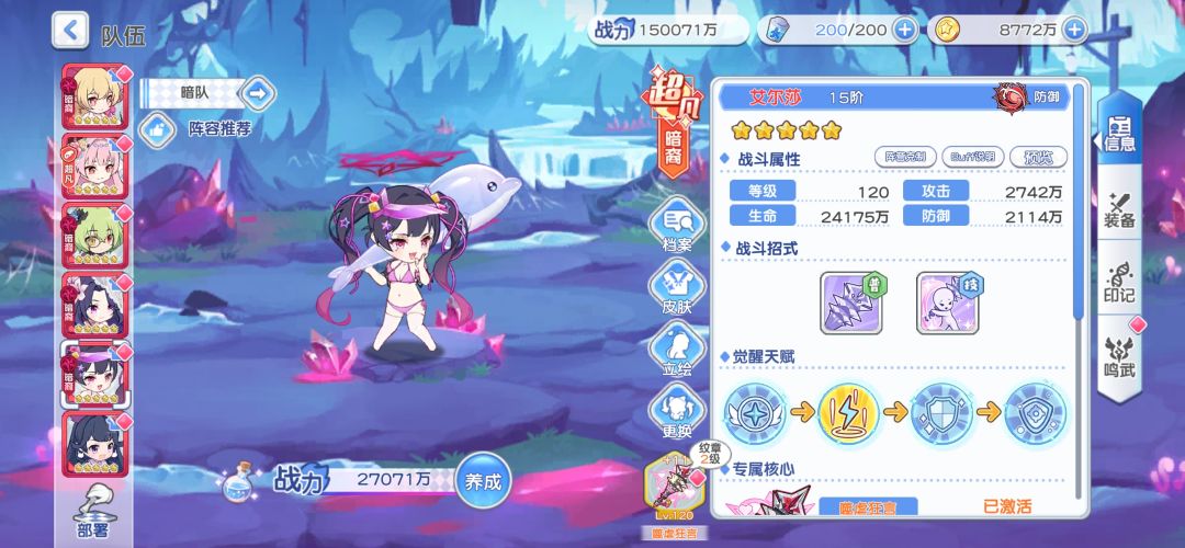 的,主要是角色相互之间起不到配合,给人一种各打各的,我们的龙娘大人也是在最近彻底坐上冷板凳,引以为傲的搭配零号克罗爱组成的零龙组合在群体复活桩已经被菈尔+弓妹爆金币了😭为龙娘大人默哀两秒半,艾尔莎的话应该是现在游戏内的最强盾角色,能抗能打,他跟小幸是比不了的,小幸是偏保护,艾尔莎更多是像北极光那种可以1打多的,而且本身暗队的强度就是靠献祭队友🤣至于为什么要献祭队友,那就不得不提下面这位了,茉尔丝塔,一个只要献祭队友就能提供强力控制的第二强控制角色,也是略逊史黛拉,毕竟别人有反制手段,卡莲的话大家对她的印象更多是pve吧,其实在PVP她就纯搅屎棍,时不时复活给你喷两下,虽然作用不大但是很恶心,亚莉娅的话刚出没多久,很多人应该也只是知道她pve把菈妮丝狠狠爆金币了,不过得亏弓妹的出现拉了一把菈妮丝,不过等下一个强力辅助菈妮丝很大概率还是会下岗,亚莉娅在PVP的作用也不低,敌方带有赤宴buff的目标受到攻击或者阵亡时亚莉娅会获得一层血,首次释放进化技可以为我方攻击最高的角色附加契,契目标阵亡时可以消耗6层血复活该目标, 每场战斗一次,并且本身还带有免疫一次致命伤害并恢复100%血量的特性,可以说保命能力和PVP辅助能力相当厉害,不过貌似赤宴印记有bug,目前是不生效的状态,可想而知亚莉娅的强度有多高,印记不生效的情况下都已经完爆菈妮丝,虽然菈妮丝本身也是个bug怪,笑死了,半年多了bug还没修,至于夕河为什么会在暗队,因为她的机制比较优秀,其实治疗这个职业在PVP实在没啥用,比如春风这个人机,由于光队整体实力太过超模,实际上有没有春风区别不大,春风:我们6个真厉害,夕河强就强在她可以复活队友,这个在游戏内为数不多的机制,赫卡特没什么好说的,也是比较适配暗队的一个角色,等新暗角色出来可以优先踢赫卡特,其实赫卡特强度真不高,缠绕终究只是一个软控制罢了,欺负那种依赖技能打伤害的就很强,但是在光暗对打这方面还有打新人类的时候作用是真不大,至于我为什么没有带龙娘,因为暗队PVP的两大主力是艾尔莎和茉尔,龙娘讲道理真可有可无,而且现在零龙也已经被爆完了,龙娘优先级现在特别低,终究只是时代的眼泪😭