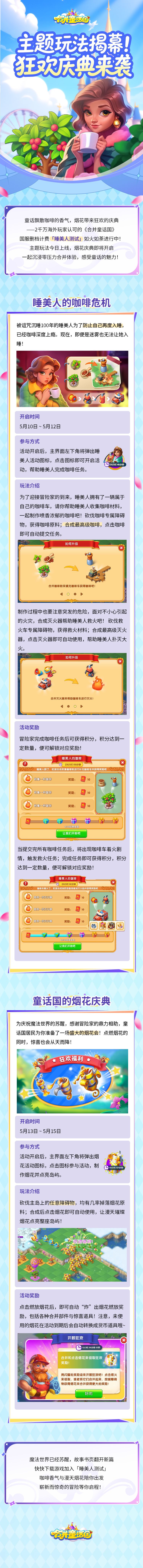 《合并童话国》主题玩法今日上线,烟花庆典即将开启,快快加入「睡美人测试」,咖啡香气与漫天烟花陪你出发,崭新而惊奇的冒险等你启程!