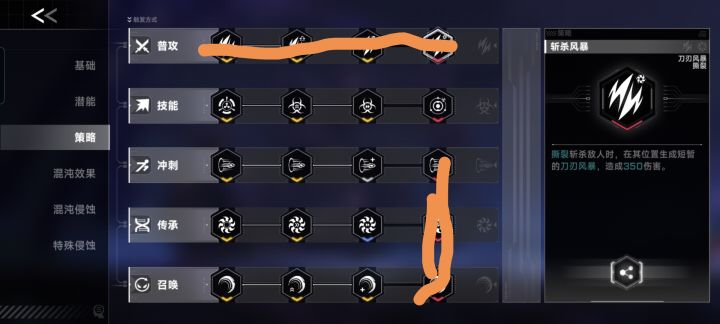 (3)黑市凹策略需要首先来普攻撕裂,火焰风暴,双向飞剑(燃烧飞剑好像也可以),注意普攻位可能被其他属性策略的普攻占位导致后续出不来,这里得凹蛮久的(凹了半个多小时,这三种策略出来之后我们开局传承的三个嗜血红策略就激活了